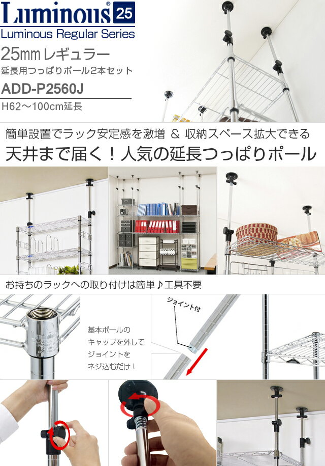 スチールラック パーツ [25mm ルミナス 対応パーツ]延長用つっぱりポール/ADD-P2560J [転倒防止ポール]高さ62?100cm(高さ60-100)×2本 ドウシシャ スチール製 ルミナスラック 収納家具/メタル ラック パーツ 収納棚 スチール棚